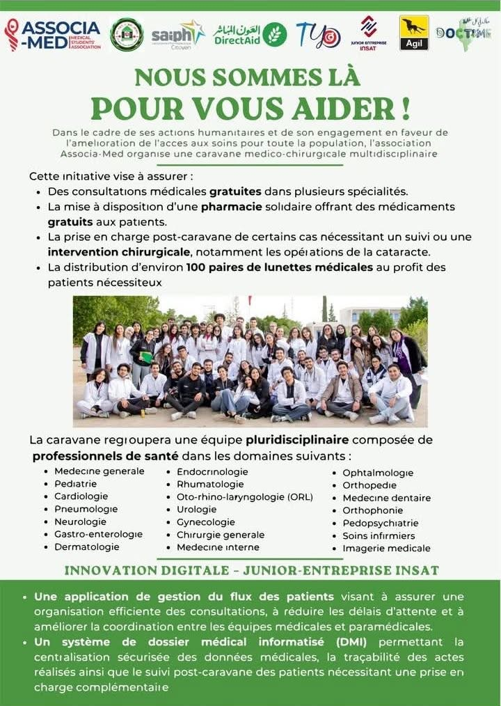 في إطار دعم الحق في الصحة وتقريب الخدمات الطبية من المواطنين، نظّمت جمعية Associa-Med بالشراكة مع عدد من المنظمات والهياكل الداعمة قافلة طبية جراحية متعددة الاختصاصات، تهدف إلى تحسين النفاذ إلى العلاج لفائدة الفئات محدودة الدخل.